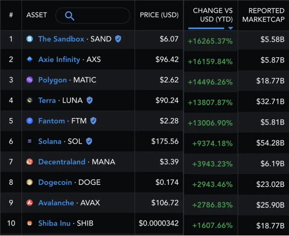 Metaverse coinleri olan The Sandbox ve Decentraland (MANA) bu listede 1. ve 7. sıraya yerleştiler. Bir Metaverse projesi olan The Sandbox göz kamaştırıcı bir şekilde 162 katlık bir artış sağladı. Rakip oldukları Decantralan (MANA) ise 40 kat büyüme kazandı. Decandraland (MANA) ve The Sandbox (SAND) Adidas ve Under Armor gibi perakende devleri sırasıyla ortaklıklarını duyurdular.