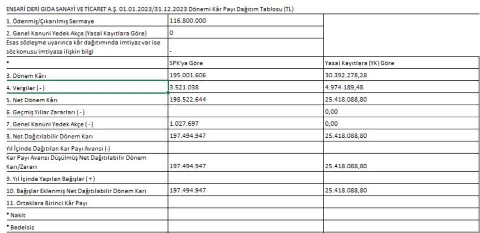 Açıklamada 2023 yılı faaliyetleri sonucu Sermaye Piyasası Mevzuatına göre oluşan 198.522.644TL dönem kârına (Yasal Kayıtlara Göre 25.418.088,80 TL faaliyet karı vardır) ilişkin bilgi verildi. Dönem karı üzerinden hesaplanan 1.270.904,44-TL tutarında Birinci Tertip Yedek Akçe düşülmesinin ardından kalan Sermaye Piyasası Mevzuatına göre oluşan 197.251.739,56TL’lik dönem kârından (Yasal Kayıtlara Göre 24.147.184,36 TL faaliyet karı vardır) kısmın geçmiş yıl karları hesabına kaydedilmesi ve temettü dağıtılmaması hususuna yönelik duyuru yapıldı.