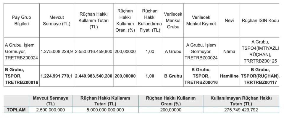 Bildirimde Trabzonspor Sportif Yatırım ve Futbol İşletmeciliği Ticaret A.Ş.'nin 10.000.000.000 TL tutarındaki kayıtlı sermaye tavanı içerisinde 2.500.000.000 TL olan çıkarılmış sermayesinin 5.000.000.000 TL bedelle artırıldığı belirtildi. Böylece şirketin sermayesinin 7.500.000.000 TL’ye çıkarılması ve şirket esas sözleşmesinin ‘Şirketin Sermayesi’ başlıklı 6. ile ‘Paylar’ başlıklı 7. maddeleri yapılan değişiklikler ile 21 Ekim 2024'te tescil edildiği ifade edildi.