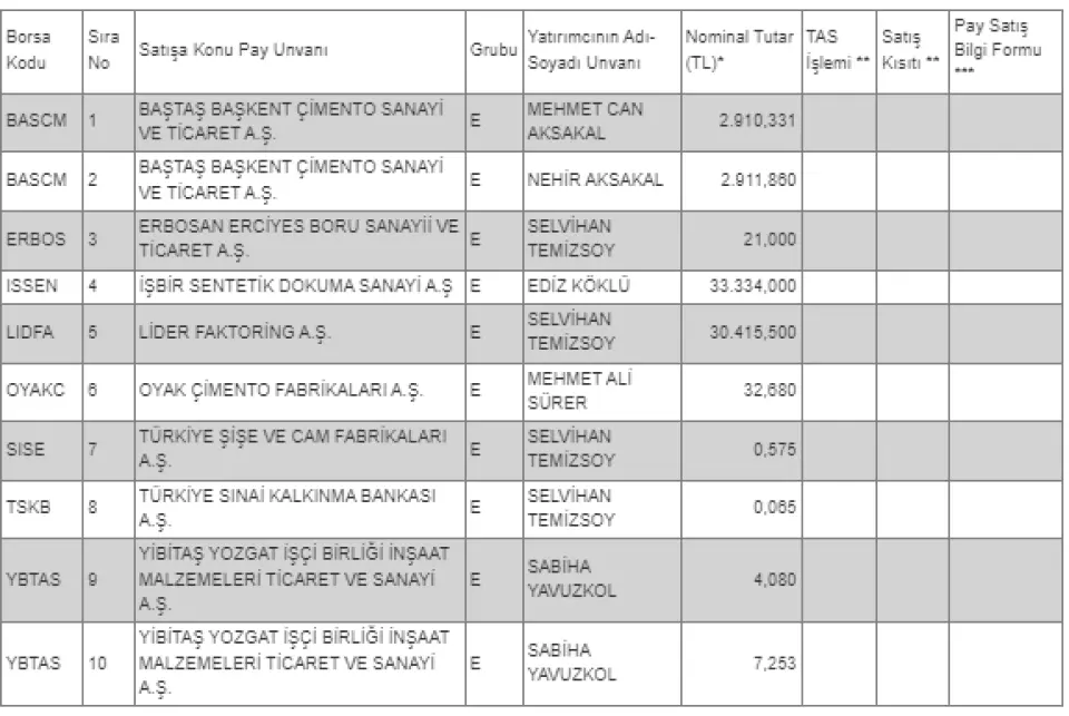 Sermaye Piyasası Kurulu'nun VII-128.1 sayılı "Pay Tebliği"'nin 15'nci maddesi gereğince, pay senetleri Borsada işlem gören ortaklıkların Kurul kaydında olan ancak Borsada işlem görmeyen statüde pay senetlerinin Borsada satışa konu edilebilmesi amacıyla Merkezi Kayıt Kuruluşu'na yapılan başvurulara ait bilgiler aşağıda yer almaktadır.
