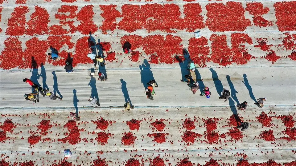 Binbir zahmetle kurutulmaya bırakılan domates işinde çalışanların büyük kısmını oluşturan, Şanlıurfa'nın Siverek ilçesinden gelen çoğunluğu kadın tarım işçileri, gün doğumuyla mesaiye başladı.