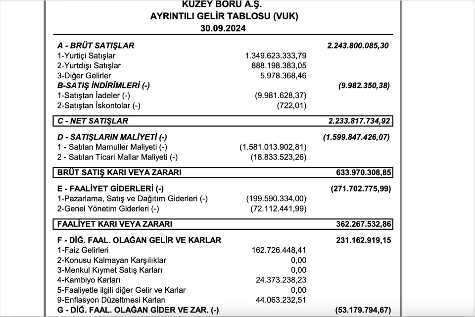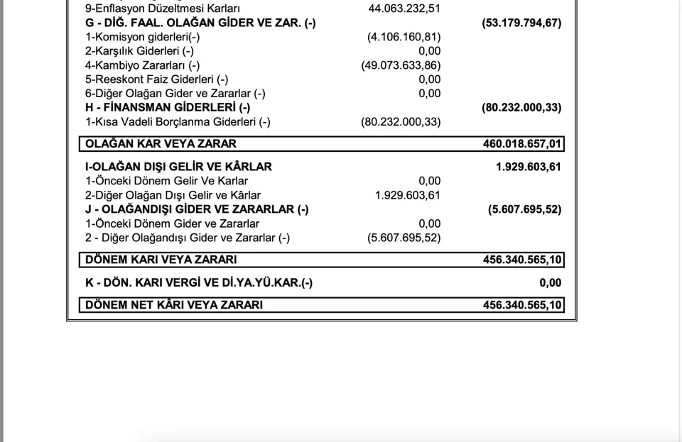01.01.2024 – 30.09.2024 dönemine ilişkin Kurumlar Geçici Vergi Beyannamesi çerçevesinde vergi dairesine sunulan ve Sermaye Piyasası mevzuatına göre düzenlenmemiş olan gelir tablosuna yer verildi. Buna göre şirket Kurumlar Geçici Vergi Beyannamesi bağlamında vergi dairesine sunulan rakamlara göre 456.340.565,10 TL kar etti.