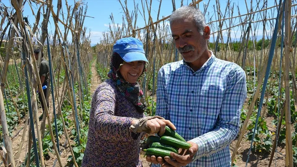 Üretici de memnunAdaören Mahallesi'nde eşiyle çiftçilik yapan Songül Yoldaş kiraladıkları arazide hibe desteğiyle salatalık ektiklerini söyledi.