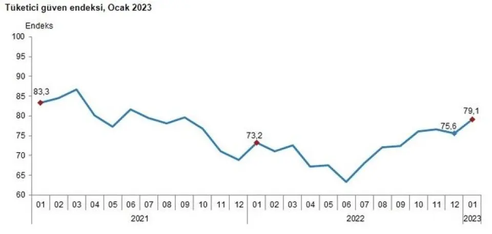 Tüketici güven endeksi ocakta aylık bazda yüzde 4,6 artarak 79,1 oldu Türkiye İstatistik Kurumu (TÜİK), ocak ayına ilişkin t...