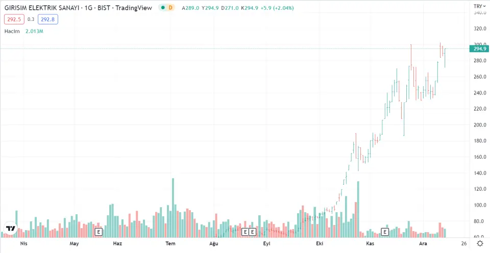 Şirket hissesi Haziran ayında 30 TL seviyesinden işlem görürken şuan 294 TL'den işlem görmekte. O tarihten bu yana yüzde 880 civarında primlenerek aldığı iş anlaşmalarıyla orantılı bir şekilde yükseldi.