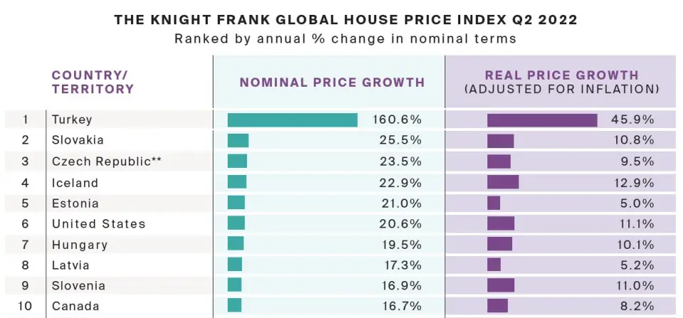 İngiltere merkezli emlak danışmanlık şirketi Knight Frank’ın raporuna göre Türkiye, 2022’deki konut kira fiyatlarındaki artışta 56 ülke arasında en üst sırada yer aldı. Emlakçılar buna fırsatçıların neden olduğunu belirtti, artıştaki yüzde 30'luk dilimin “balon” olduğunu söyledi..