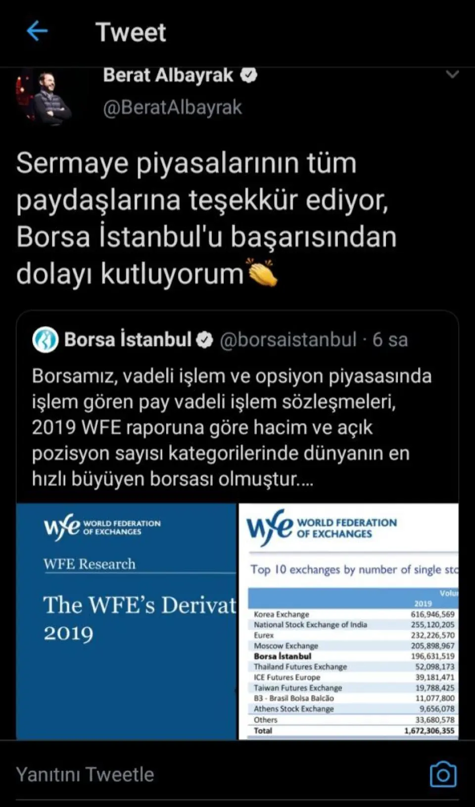 “Borsa İstanbul, 1961’de Londra’da kurulan ve Borsa İstanbul’un da üyesi olduğu WFE 2019 raporuna göre, büyük bir başarıya imza attı. Raporda, Borsa İstanbul’un Vadeli İşlem ve Opsiyon Piyasası’nda 2012’de işlem görmeye başlayan ve 39 adet likit pay üzerine çıkarılan Pay Vadeli İşlem Sözleşmeleri’nde hacim ve açık pozisyon sayısı kategorilerinde dünyanın en hızlı büyüyen borsası olduğu kaydedildi.”