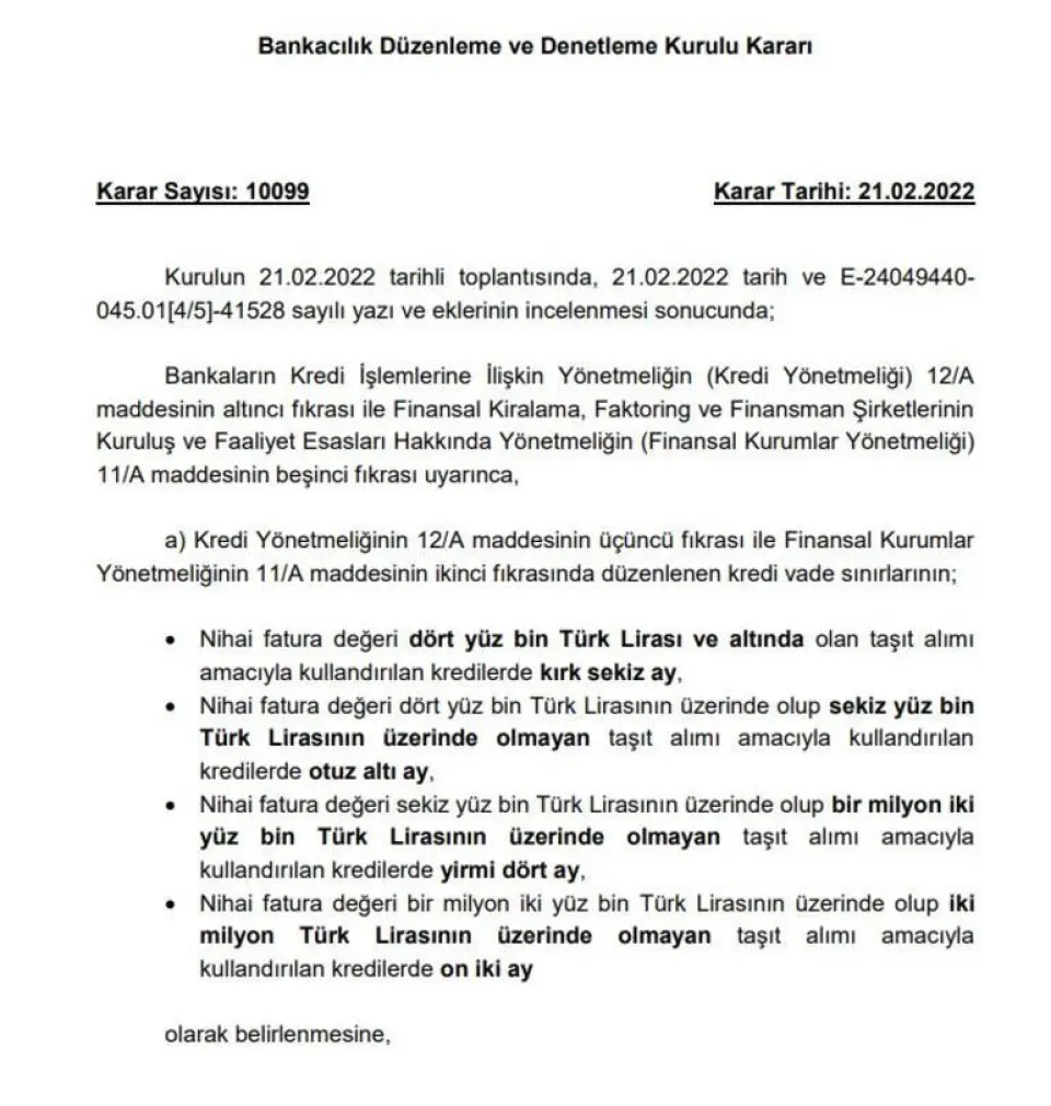 Otomotiv fiyatlarında yaşanan artıştan sonra sektörü durma noktasına getiren taşıt kredileriyle ilgili harekete geçildi. Bankacılık Düzenleme ve Denetleme Kurulu yeni kararı açıkladı. Değeri 400 bin TL ve altında olan taşıtlar için kredi tutarı yüzde 70'i aşamayacak.