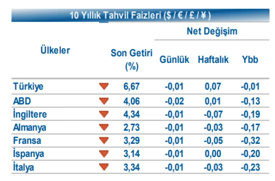 Türkiye’nin 5 yıllık Dolar cinsi CDS risk primi 222 bp seviyesinden işlem görürken, Kasım 2036 vadeli 10 yıllık Eurobond 1 bp azalışla %6,67 seviyesinden işlem gördü. Döviz tarafında, majör para birimlerinin çoğunluğu ABD Dolar’ı karşısında değer kazandı.