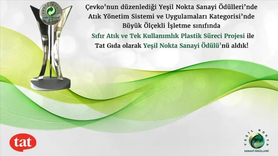 İSTANBUL (AA) - Tat Gıda, Çevre Koruma ve Ambalaj Atıkları Değerlendirme Vakfı (ÇEVKO) tarafından bu yıl beşincisi düzenlenen “Yeşil Nokta Sanayi Ödülleri’nde Büyük Ölçekli İşletme kategorisinde “Sıfır Atık ve Tek Kullanımlık Plastik Süreci” projesiyle ödüle layık görüldü.