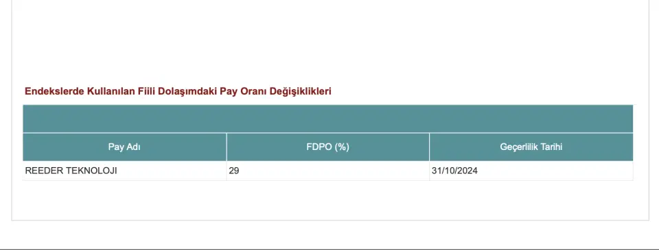 Reeder Teknoloji Sanayi ve Ticaret A.Ş. (REEDR) hakkındaki endekslerde kullanılan fiili dolaşımdaki pay oranı değişikliği duyuruldu.