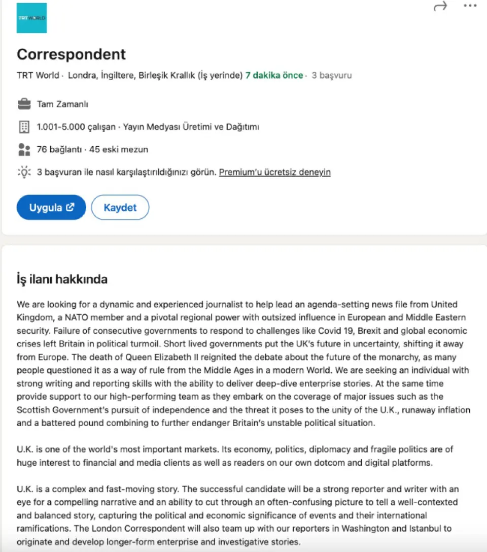 TRT World ilanında herhangi bir siyasi lideri hedef almadan “Art arda gelen Britanya hükümetlerinin COVID-19 salgını, Brexit, küresel ekonomik kriz gibi büyük meydan okumalara yanıt vermekte başarısız olması İngiliz siyasetini bir karmaşa içine soktu. Kısa süreli İngiliz hükümetleri ülkenin geleceğini belirsizlik içinde bırakıyor ve İngiltere’yi Avrupa’dan uzaklaştırıyor. Kraliçe Elizabeth’in ölümüyle birlikte, Orta Çağ’dan kalma bir yönetim biçimi olarak Kraliyet’in modern çağda varlığı tartışmaları hız kazandı. Bu konularda kapsamlı haberler yapabilecek, kalemi kuvvetli muhabirlere ihtiyacımız var” denildi.