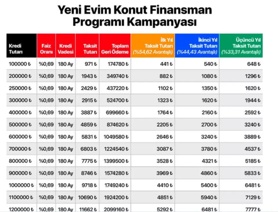 Yeni Evim Kampanyası büyük ses getirdi. Çok düşük faiz oranı, uzun vade ve Hazine desteğiyle birlikte konut almak kolaylaştı. 5 milyon liraya kadar kredi verilecek ve 3 bölgeye özel kredi tutarları belirlendi. 1 milyon lira kredi kullanan birisi ilk yıl 4410 lira, ikinci yıl 5400 lira, üçüncü yıl ise 6481 lira aylık ödeme yapacak. Hazine vereceği destekle kredi taksitleri üzerindeki yükü azaltacak.