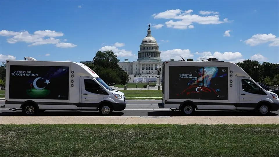 "15 Temmuz, Türk Demokrasisinin Zaferi" ve ''Türk Milletinin Zaferi'' yazılı ilan kamyonları, New York'un Manhattan, Brooklyn ve Queens bölgelerinin en işlek caddeleriyle başkent Washington DC ve FETÖ'nün karargahının bulunduğu Pennsylvania'daki çiftlik etrafında gün boyu dolaştı.