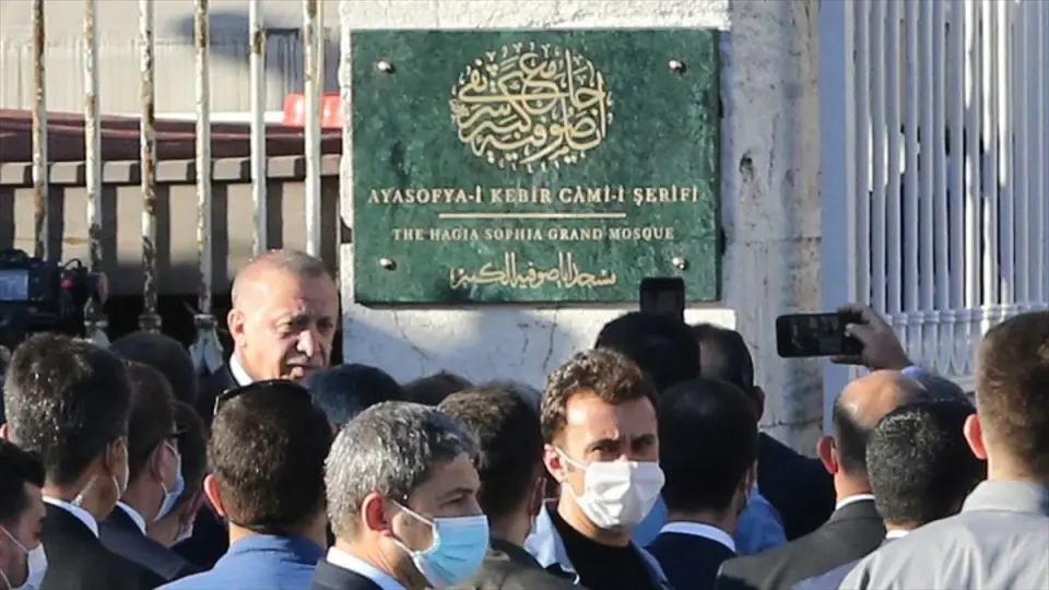 Erdoğan ve beraberindekiler Ayasofya Camisi'nin girişine gelerek "Ayasofya-i Kebir Cami-i Şerifi" yazan tabelayı açtı, tabela önünde fotoğraf çektirdi.