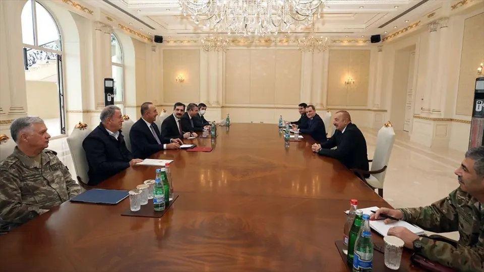 Bakanlar Çavuşoğlu ile Akar, beraberlerinde Kara Kuvvetleri Komutanı Orgeneral Ümit Dündar ile Cumhurbaşkanlığı Sarayı'nda Azerbaycan Cumhurbaşkanı Aliyev ile bir araya geldi.