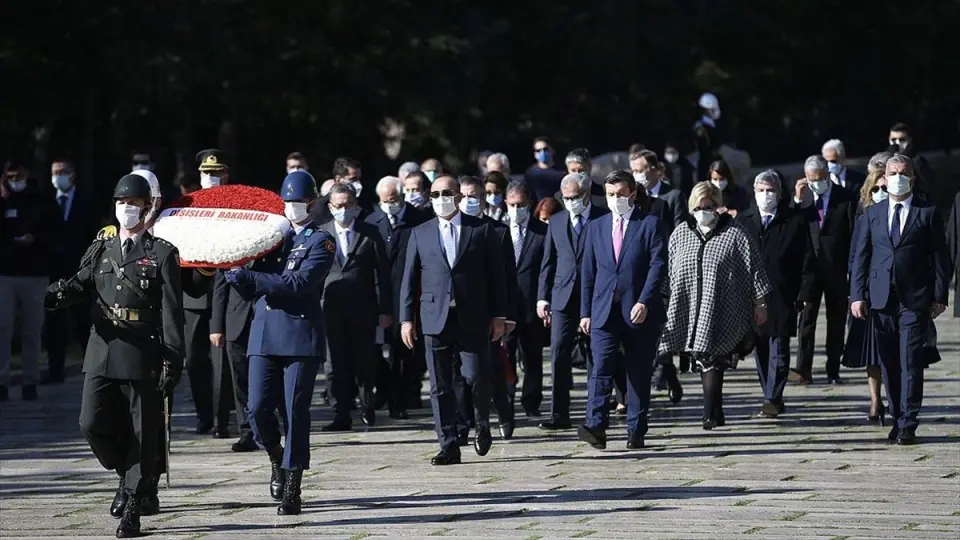 Bu sene yeni tip koronavirüs (Kovid-19) salgını nedeniyle sadece merkezde görev yapan büyükelçilerin hazır bulunduğu ziyarette Bakan Çavuşoğlu Atatürk'ün mozolesine çelenk bıraktıktan sonra saygı duruşunda bulunuldu.