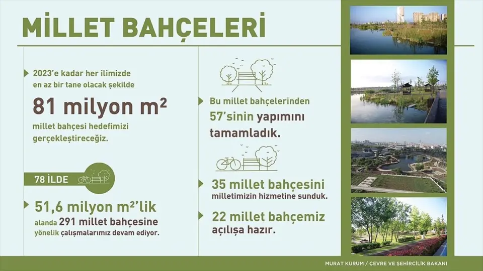 "2023'e kadar her ilimizde en az bir tane olacak şekilde 81 milyon metrekare hedefimizi gerçekleştireceğiz. 78 ilde 51,6 milyon metrekarelik alanda 291 millet bahçesinde çalışmalarımız devam ediyor. 57 millet bahçesini tamamladık. 35 millet bahçesini hizmete sunduk. 22 millet bahçesi açılışa hazır."
