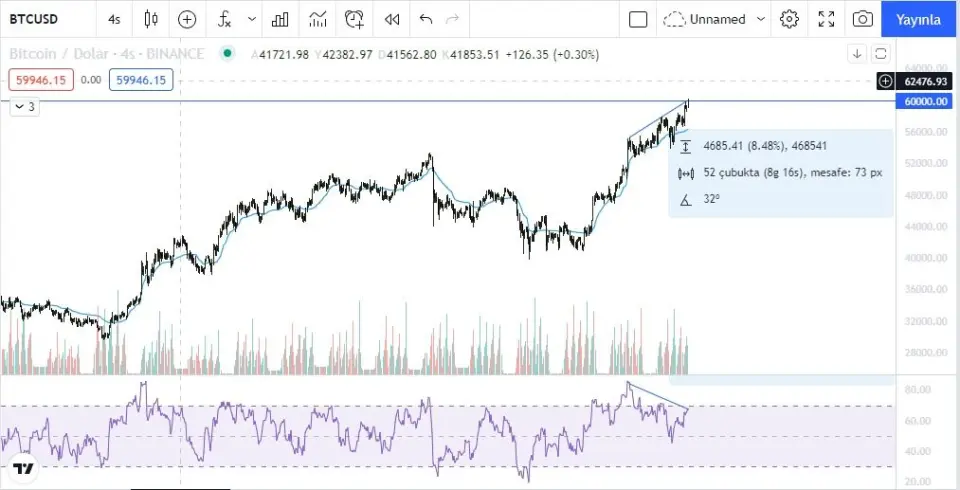 Bitcoin 60.000 dolar direncini kıracak mı ? 60.000 dolar psikolojik direncini kırması beklenen Bitcoin Şuan sınırda . 60.000 direncini zorlayan Bitcoin anlık olarak 59.900 ve 60.000 arasında gidip geliyor. BTCUSDT 4 saatlik grafikte 60000 psikolojik direnci kırmak üzere. Boğalar çok iştahlı. Kırarsa tarihi zirveyi test etmek isteyebilir. Fakat bu son boğa iştahını RSI desteklemiyor.