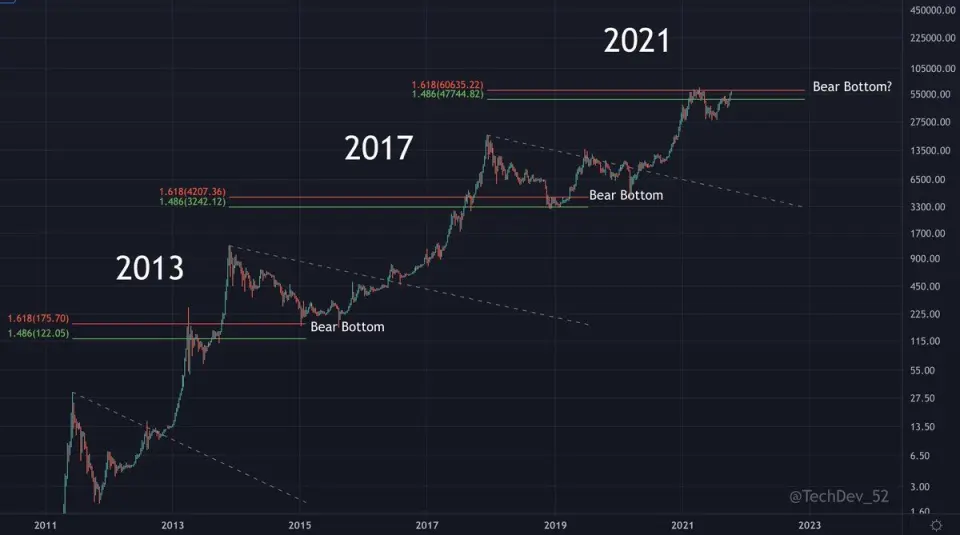 TechDev, Fibonacci düzeltme seviyelerini kullanarak, her Bitcoin ayı piyasasındaki dip seviyenin benzer aralıkta olduğunu ortaya koydu. Bu durum, hem 2014'teki 200 doların altındaki dip seviyeyi, hem de Aralık 2018'deki kabaca 3.200 doları açıklıyor.