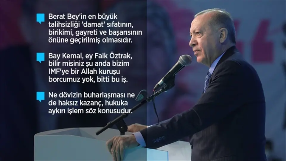 "Küresel tedarik zincirlerinin ciddi yaralar aldığı, üretimden istihdama küresel ekonominin her alanda daraldığı bu dönemde de Berat Bey'in sorumluluğunda aldığımız hızlı ve etkin tedbirlerle ülkemizin süreci en az zararla geçirmesini sağladık. Berat Bey de hukuk çerçevesinde bugün itibarıyla tabii ki yargıda hakkını arayacaktır. Aynı şekilde ben de birçok davalar açtım. Açtığım her davayı da kazanıyorum. Ondan sonra dert yanıyor. 'Şimdi yargıya giderler.' diye. Nereye gideceğim? Gideceğimiz tek yer var yargı. Senin paran bol zaten. Senden o parayı alıp, onları da fakir fukaraya garip gurebaya dağıtacağız. Yapacağımız iş bu."