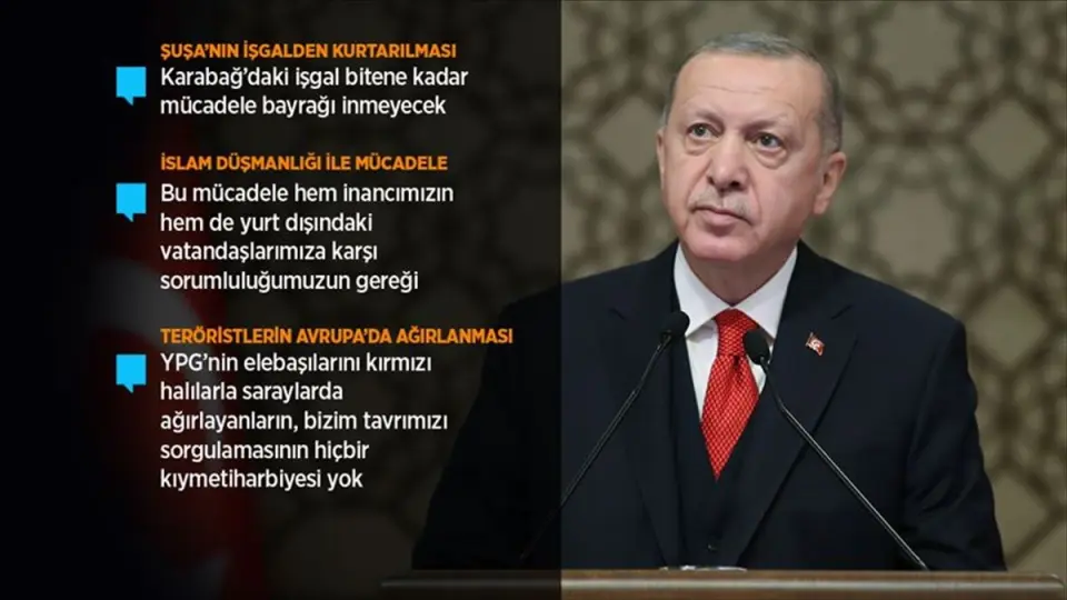 Azerbaycan topraklarının işgal edilmesine sessiz kalmalarının mümkün olmadığını ve sessiz kalmadıklarını vurgulayan Erdoğan, "İşte biz şu anda Afganistan'dayız, şu anda Azerbaycan'dayız. Niye? Bunlar kardeşlerimiz, soydaşlarımız. Ermenistan'ın 28 yıllık zulmü karşısında Minsk Üçlüsü ne yazık ki her türlü ihtimallerle bizim Azeri kardeşlerimizi orada, Azeri Türklerin ifadesi ile 'kaçkın yaşattı'. Toprakları işgal altında olduğu için onlar merkeze gelmek zorunda kaldı. 28 yıl süren bu acımasız işgale Minsk Üçlüsü çözüm üretmedi. Hep oyalamaca, hep oyalamaca. Bunu kendileriyle konuştuğumuzda da bize hiçbir zaman bir çözüm üretmediler. Çünkü çözüm üretmek gibi bir dertleri de yoktu. Şimdi Azeri kardeşlerimiz kendi göbeklerini kendileri kesti." ifadelerini kullandı.