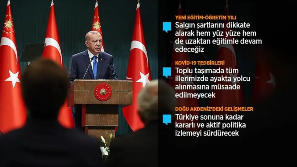 "Ancak mevcut durum da bizim için kabul edilebilir değildir. Vaka ve vefat sayılarındaki kısmi yükselişten derin üzüntü duyuyoruz. Vatandaşlarımızdan 'tamam' diye ifade ettiğimiz temizlik, maske, mesafe kurallarına sıkı bir şekilde riayet etmelerini bekliyoruz. Ayrıca her ilimizde ihtiyaçlara göre ilave tedbirler alıyoruz. Bu çerçevede kafe ve restoranlar kurallara uygunluk bakımından çok daha sıkı şekilde denetlenecektir. Toplu taşımada tüm illerimizde ayakta yolcu alınmasına kesinlikle müsaade edilmeyecektir. Riskli illerde İl Hıfzıssıhha Kurulu kararıyla kapasite sınırlamasına da gidilebilecektir. Maske kullanımı başta olmak üzere kurallara uymayanlara kesilen cezalar muhakkak tahsil edilecektir. Esnek ve kademeli mesai usullerinin yaygın şekilde tatbiki sağlanacaktır."