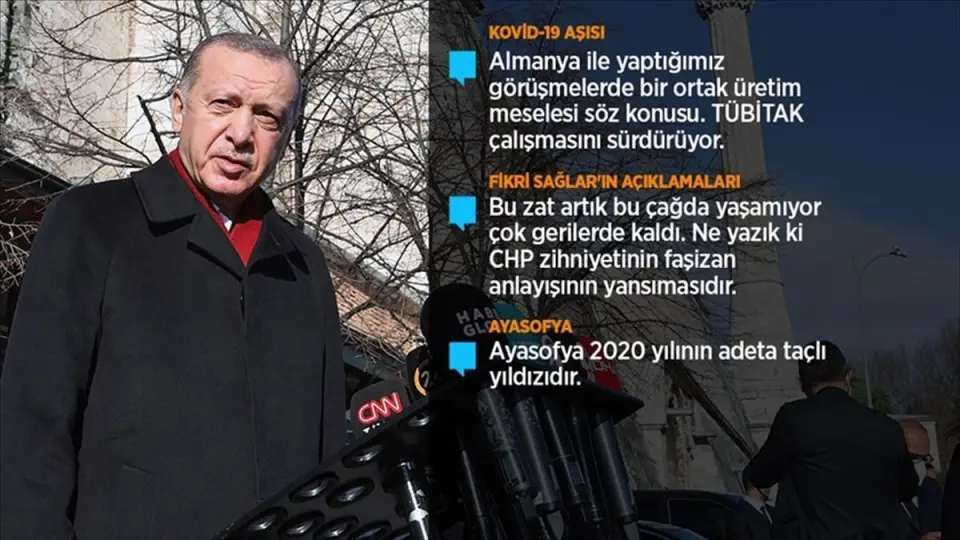 Cumhurbaşkanı Erdoğan, Sözcü gazetesinin "2020'de hatırlanmak istenmeyen, felaket ve gözyaşı" olarak nitelediği olaylar arasına Ayasofya-i Kebir Cami-i Şerifi'nin açılmasını eklemesine ilişkin, "Ben Sözcü gazetesini okumuyorum. Kimse de buna para verip almasın. Ayasofya 2020'nin adeta taçlı yıldızıdır." dedi.