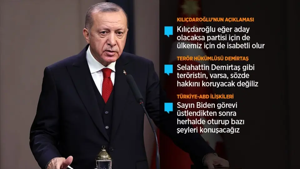 Erdoğan, bir gazetecinin ABD seçimleri sonrasında yeni yönetimle birlikte Türkiye-ABD ilişkilerinde nasıl bir süreç beklediğini sorması üzerine, "Ben Biden'la yabancı birisi değilim. Biden'la Obama döneminden de gayet iyi tanışan birisiyim." karşılığını verdi.
