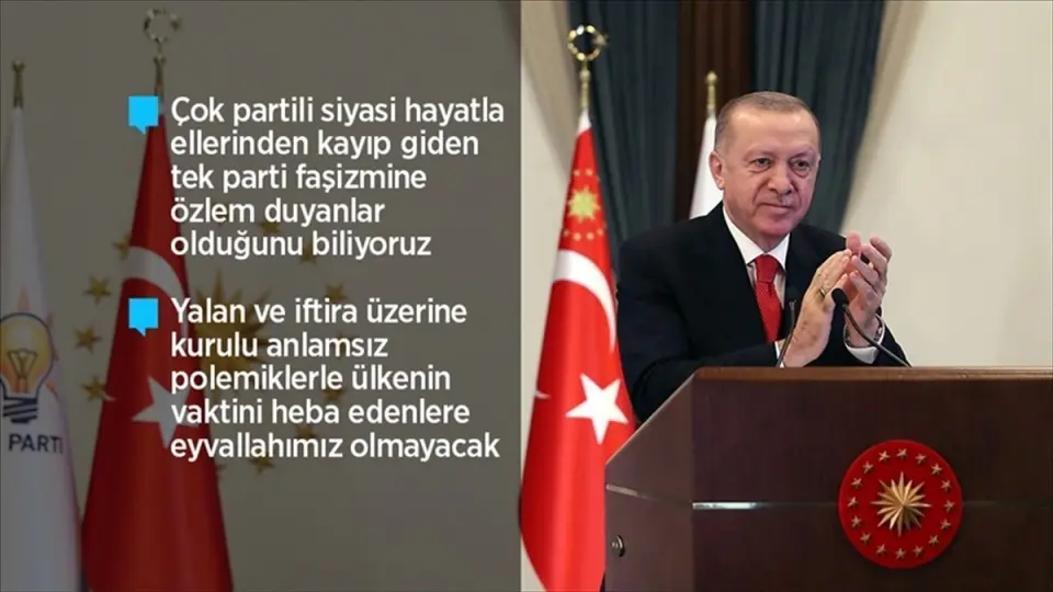"Bununla yetinmiyor, 2023 hedeflerimizle çıkıyoruz, onunla da yetinmiyor 2053 vizyonumuzu, 2071 hayallerimizi konuşuyoruz. İçinden geçtiğimiz şu dönemde, sadece salgınla mücadele etmekle kalmıyor, Türkiye'yi küresel, siyasi ve ekonomik sistemin en üst seviyesine çıkarmanın hazırlıklarını yapıyoruz. Varsa bizimle bu konularda rekabet edecek birileri, onlarla her türlü yarışa hazırız. Buna karşılık yalan ve iftira üzerine kurulu anlamsız polemiklerle ülkenin vaktini, milletin enerjisini heba edenlere elbette eyvallahımız olmayacaktır. Milletimize saygımız gereği yalanlarını ve iftiralarını ortaya sürerken, asıl gündemimizden asla kopmayacağız. Kendi partileri içindeki taciz, tecavüz, hırsızlık, ahlaksızlık skandallarıyla yüzleşmeyenlere milletimizin ilk seçimde ağır bir ders vereceğini, Cumhur İttifakı olarak bugünden görüyor ve buna inanıyoruz. Bunları kendi karanlıklarıyla kendi çirkinlikleriyle baş başa bırakıyoruz."