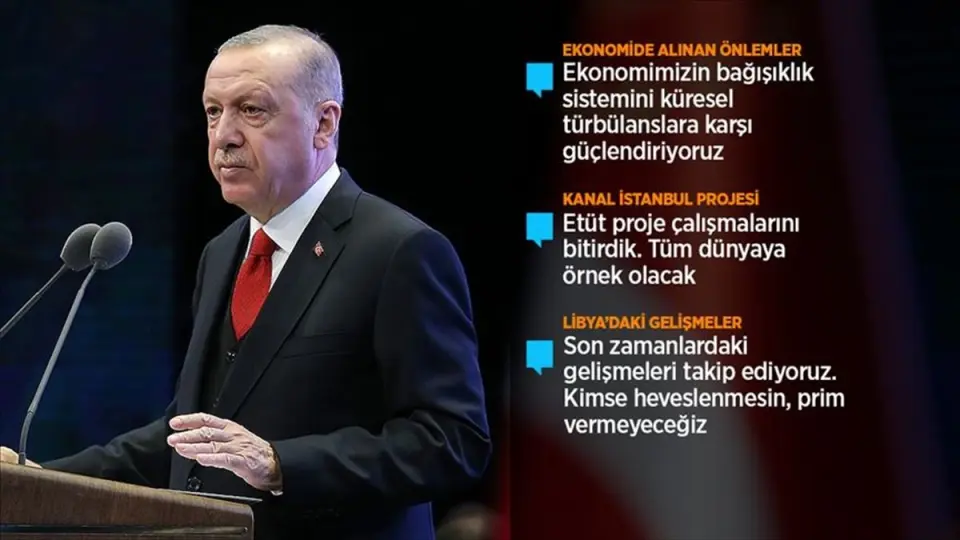 Bu saldırıların etkileri ile mücadele kapsamında, ekonominin bağışıklık sistemini küresel türbülanslara karşı güçlendirdiklerini ifade eden Erdoğan, ''Spekülatif ve art niyetli finansal girişim konusunda önlemlerimizi alıyoruz. Katma değerli, istihdama ve ihracata dayalı üretimi önceleyen bir ekonomik işleyişi yerleştirmeye özellikle çalışıyoruz. Özel sektör için uzun vadeli, ucuz ve sürdürülebilir finansman modellerine sahip bir ekonomi hedefliyoruz. Orta Vadeli Programı, bütüncül bir yaklaşım ile 'Yeni Ekonomi Programı' olarak kurguladık. Bu programın ilk döneminde 'enflasyon-kur-faiz' sarmalına karşı tedbirleri geliştirdik.'' diye konuştu.