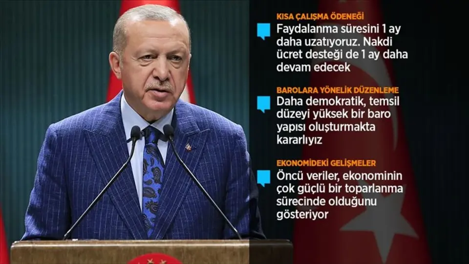Cumhurbaşkanı Erdoğan, "Kısa Çalışma Ödeneği'nden faydalanma süresini 1 ay daha uzatıyoruz. Bununla bağlantılı, nakdi ücret desteği de 1 ay daha devam edecek. Bununla bağlantılı olarak iş feshi sınırlaması ve dolayısıyla nakdi ücret desteği de 1 ay daha devam edecektir." diye konuştu.