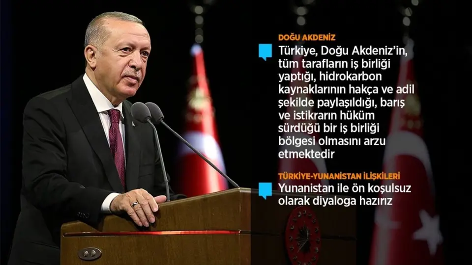 "Hidrokarbon faaliyetlerinin durdurulmasının istenmesi, haksız ve adaletsiz..."Türkiye'nin, Doğu Akdeniz'de deniz yetki alanlarının uluslararası hukuka uygun, hakça ve adil şekilde sınırlandırılmasını savunduğunu belirten Cumhurbaşkanı Erdoğan, satşöyle devam etti: