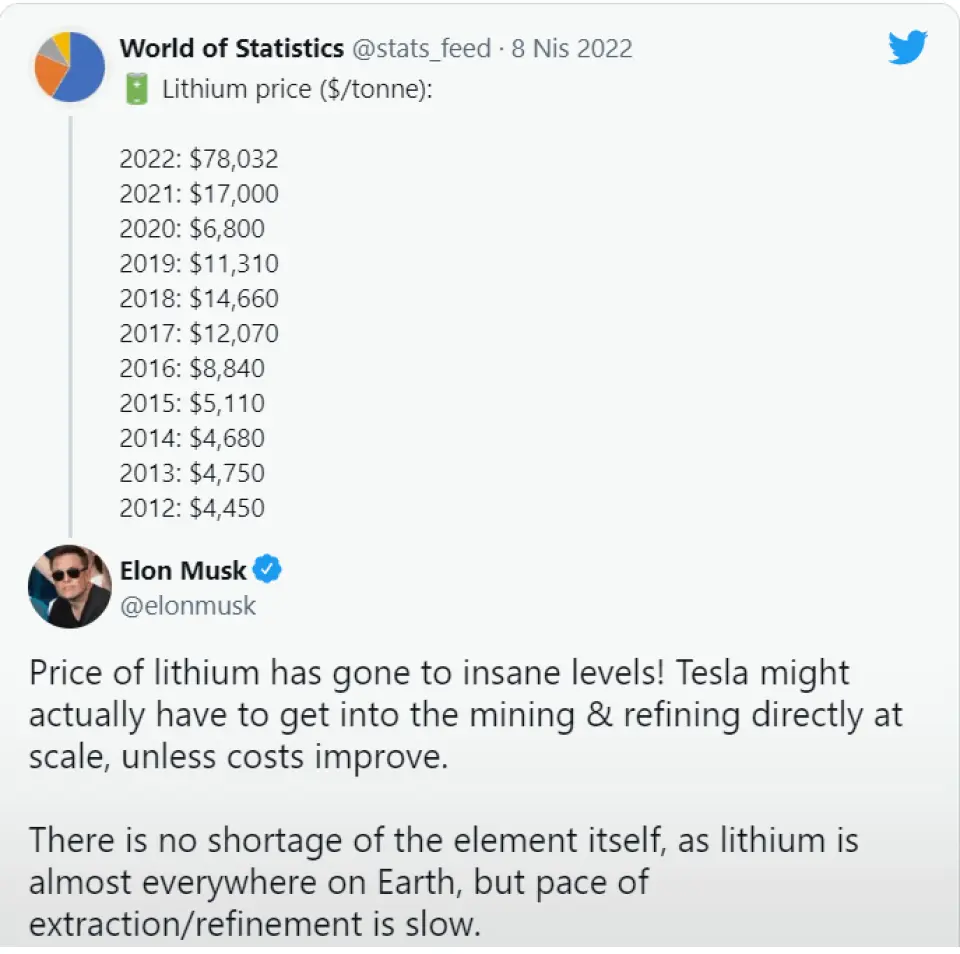 Elon Musk sosyal medya platformu twitter üzerinden pil üretiminin önemli bileşeni metalin fiyatının çok yükselmesinden dolayı, Tesla'nın lityum madenciliği ve rafineri işine doğrudan ve geniş ölçekte girebileceğini söyledi.