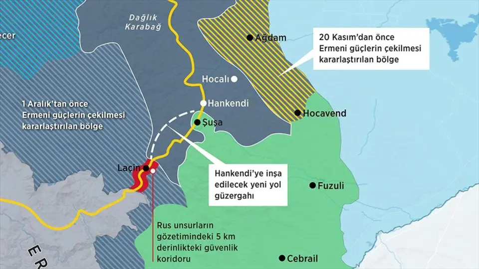 Azerbaycan ordusunun 27 Eylül'de başlattığı operasyonda, 5 kent merkezi, 4 kasaba ve 286 köyün kurtarılması üzerine Ermenistan yenilgiyi kabul etmiş, işgal altındaki Ağdam, Laçın ve Kelbecer illerini de boşaltacağını taahhüt eden anlaşmaya imza atmıştı.