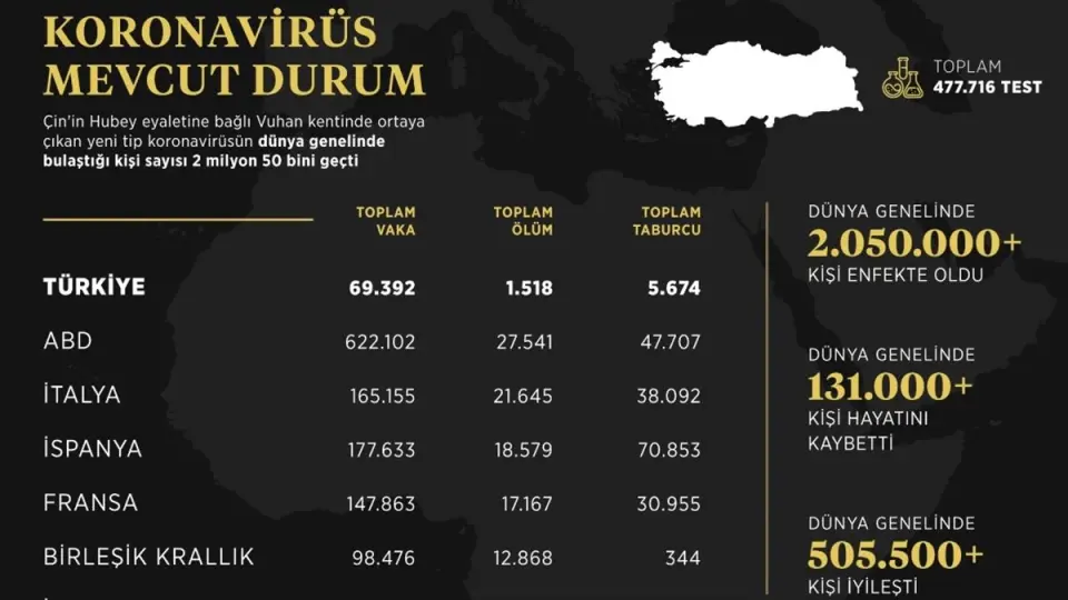 Türkiye'de şu ana kadar toplam 477 bin 716 test yapıldığı, 69 bin 392 koronavirüs vakası tespit edildiği, 1518 vatandaşın hayatını kaybettiği, 5 bin 674 hastanın iyileştiği ifade edildi.