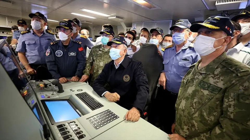 Atışın yapılacağı milli gemi TCG Kınalıada korvetinde Donanma Komutanı Oramiral Ercüment Tatlıoğlu tarafından karşılanan Akar ve komutanlara faaliyete ilişkin brifing verildi.