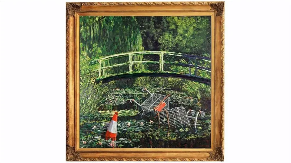 Monet'nin Giverny'deki bahçesinde nilüferleri resimlediği eserine terk edilmiş market arabaları ve trafik konisi eklediği "Show Me The Monet", Banksy'nin toplumdaki çevre duyarsızlığına eleştiri olarak yorumlanıyor.