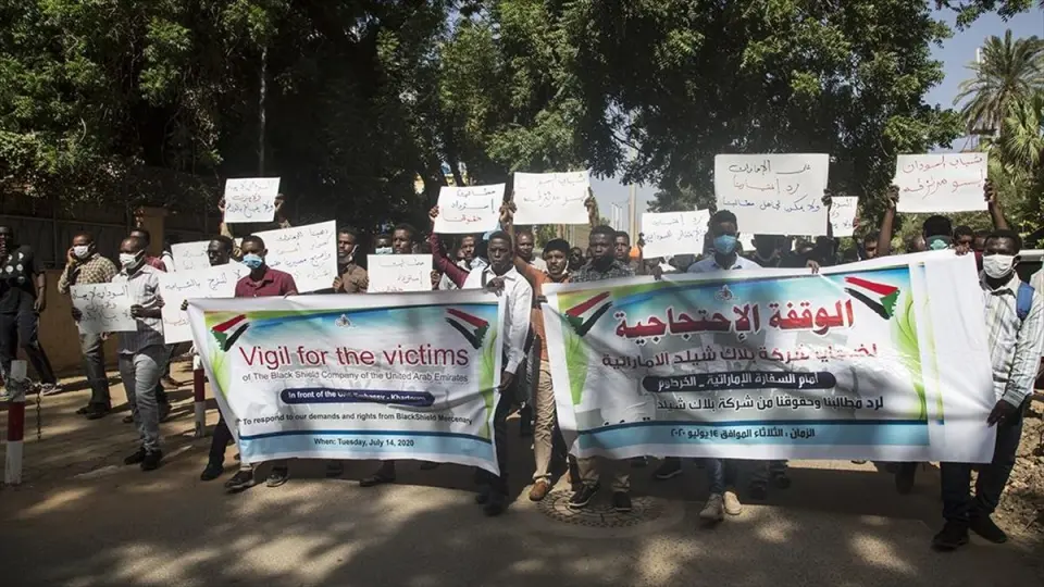 Protestocular, Sudanlı gençleri güvenlik görevlisi olarak çalışacakları vaadiyle kandırıp, askeri kamplara götüren BAE’li Black Shield şirketini protesto etti ve haklarının tazmin edilmesini istedi.