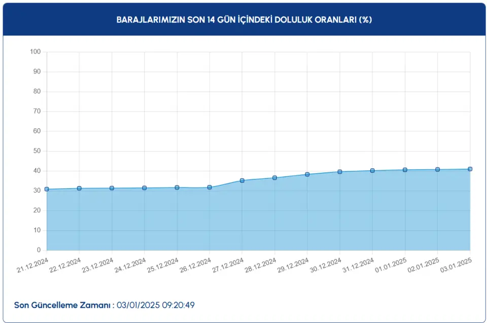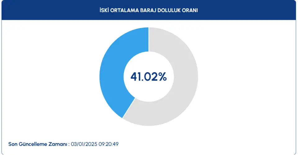 İSKİ tarafından 03.01.2025 tarihinde saat 09.20'de paylaşılan verilere göre İSKİ ortalama baraj doluluk oranı - %41.02