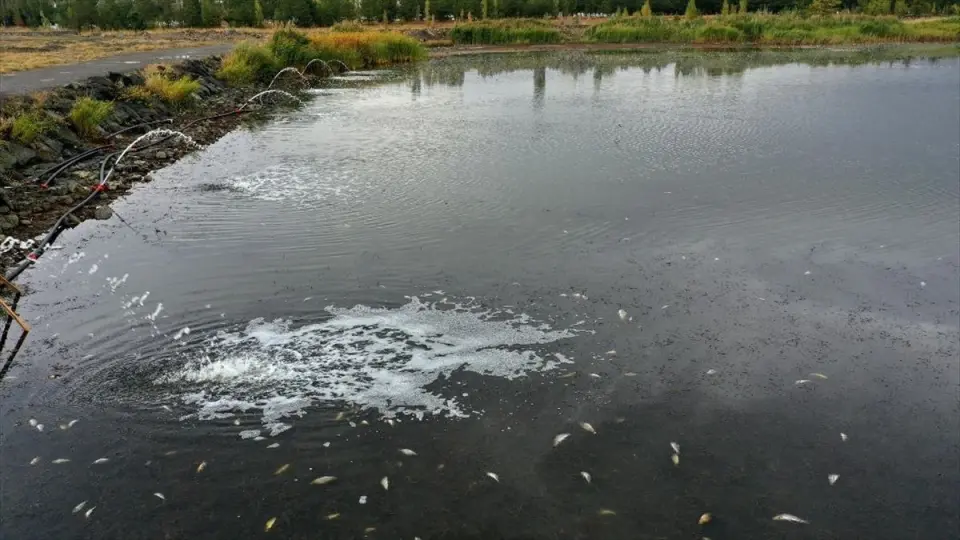 Belediye ekipleri, göl kenarına kurduğu devridaim pompalarıyla sudaki oksijeni yenileyerek balık ölümlerinin önüne geçmeye çalışıyor.
