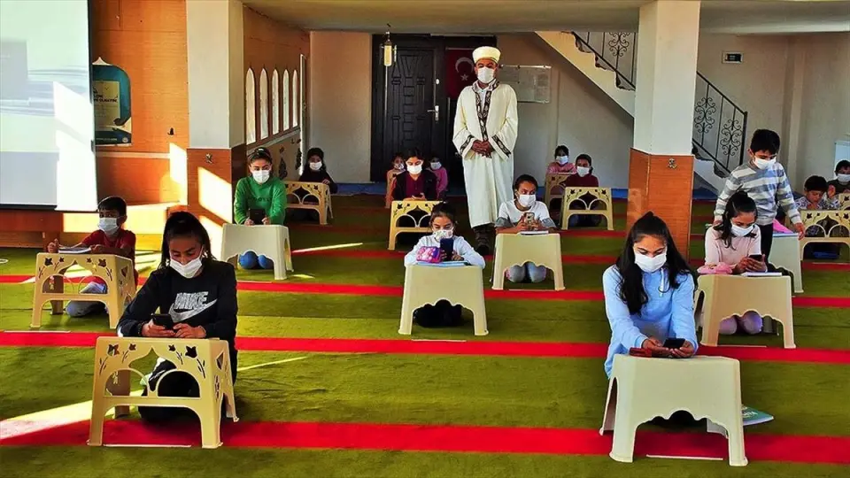Cami girişinde ateşlerini ölçüp maskelerini kontrol ettiği, ellerini dezenfekte ettirdiği öğrencileri içeri alan Kertil, çocukların sosyal mesafe kurallarına uygun yerleştirilen rahlelerin üzerinden tablet ve telefonlarıyla derslerini takip etmelerine imkan tanıyor.