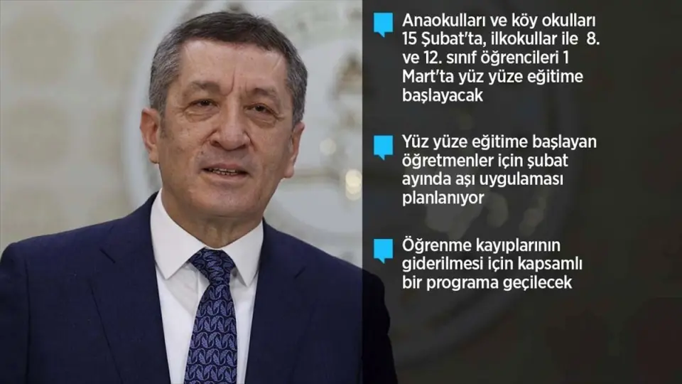 Hepinizin bildiği gibi öğretmenlerimiz Kovid-19 aşısının uygulama sıralamasında öncelikli gruba alınmıştı. Süreci hızlandırmak adına, yüz yüze eğitime başlayan öğretmenlerimiz için şubat ayı içerisinde aşı uygulamasının yapılması planlanmaktadır. Sağlık Bakanlığımızın da tespitleri doğrultusunda özellikle bazı illerimizde salgınla ilgili vaka sayılarının çok düşük seviyelerde olduğu görüyoruz. Önümüzdeki süreçte salgının da seyrine bağlı olarak il hıfzıssıhha kurullarının ve valiliklerin kararı doğrultusunda farklı sınıf düzeyleri ve okul kademelerinde de il bazlı olarak yüz yüze eğitime başlanmasıyla ilgili kararlar alınabilecektir."