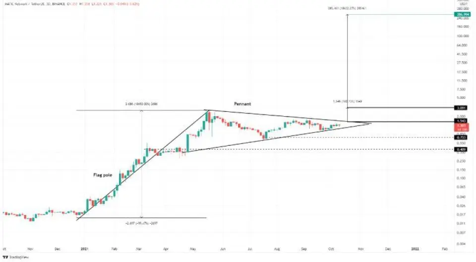 Popüler kripto para MATIC, yükseliş flaması modeli ile pozitif bir görünüm sergiliyor. Aralık 2020 ile Mayıs 2021 arasındaki gerçekleşen %18.650’lik artış, bayrak direğini oluştururken konsolidasyon dönemi flamayı yarattı. Bu model, bayrak direğinin yüksekliğini ölçerek 1.543 dolardaki kırılma eklenerek belirlenen 287 dolara %18.650’lik yükseliş sinyali veriyor. Analistlerin bu tahmini oldukça çılgınca gelse de kripto para topluluğu bu tür artışlara sıklıkla tanık oldu.