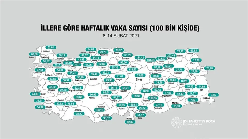 Bakanlığın "covid19.saglik.gov.tr" adresinde Türkiye haritası üzerinden yayımlanan verilere göre, her 100 bin kişide illere göre haftalık (8-14 Şubat) Kovid-19 vaka sayısı şöyle: