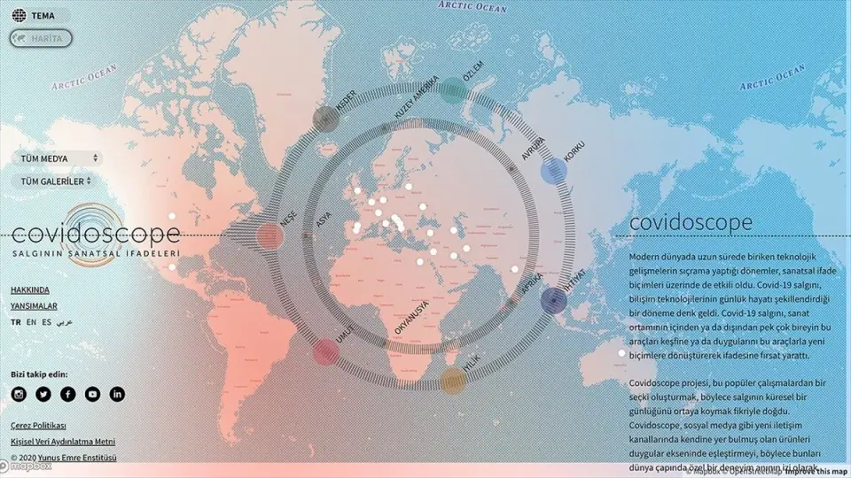 Yunus Emre Enstitüsünün (YEE), yeni tip koronavirüsün (Kovid-19) küresel çapta duygusal ve sanatsal dışavurumlarına ayna tutan Covidoscope projesi, internette Türkçe, İngilizce, Arapça ve İspanyolca dillerinde ziyarete sunuldu.