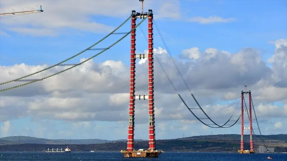 Hizmete girdiğinde "dünyanın en büyük orta açıklıklı asma köprüsü" unvanını alacak, renkleri, figürleri ve diğer özellikleriyle özgün mimariye sahip 1915 Çanakkale Köprüsü'nün inşası sürüyor.