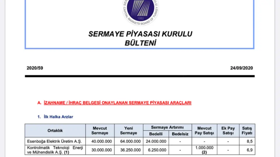 Esenboğa Elektrik Üretim A.Ş.ve Kontrolmatik Teknoloji Enerji ve Mühendislik A.Ş. izahnamesini onayladı.