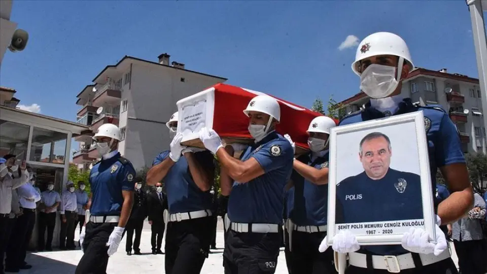 Törende şehit Kuloğlu'nun eşi Yıldız ile oğlu Doğukan ayakta durmakta güçlük çekti. Polis yeleği giyen Doğukan, babasını selam vererek, uğurladı.