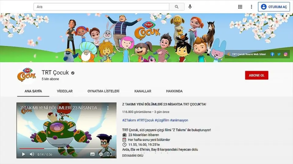 TRT Çocuk YouTube kanalı, yaklaşık 4 bin video ve 4 milyarın üzerinde görüntülenme ile en çok etkileşime sahip kanallar arasında bulunuyor.